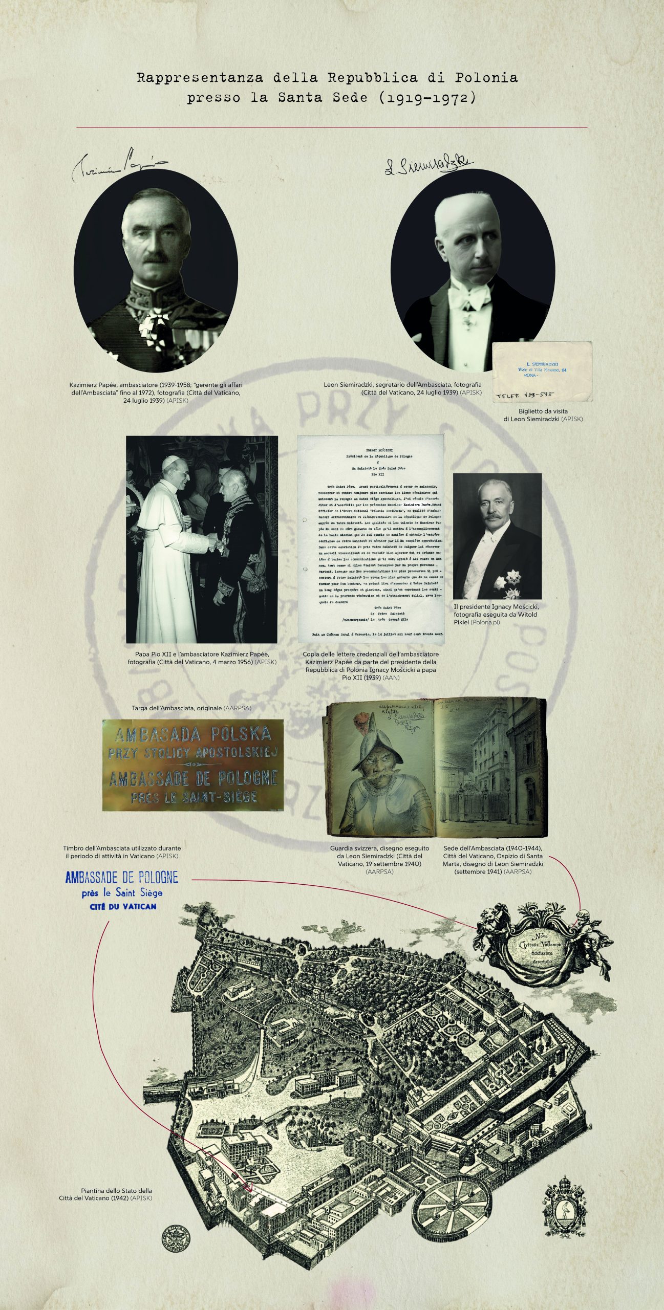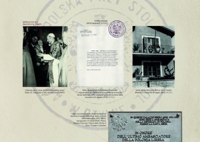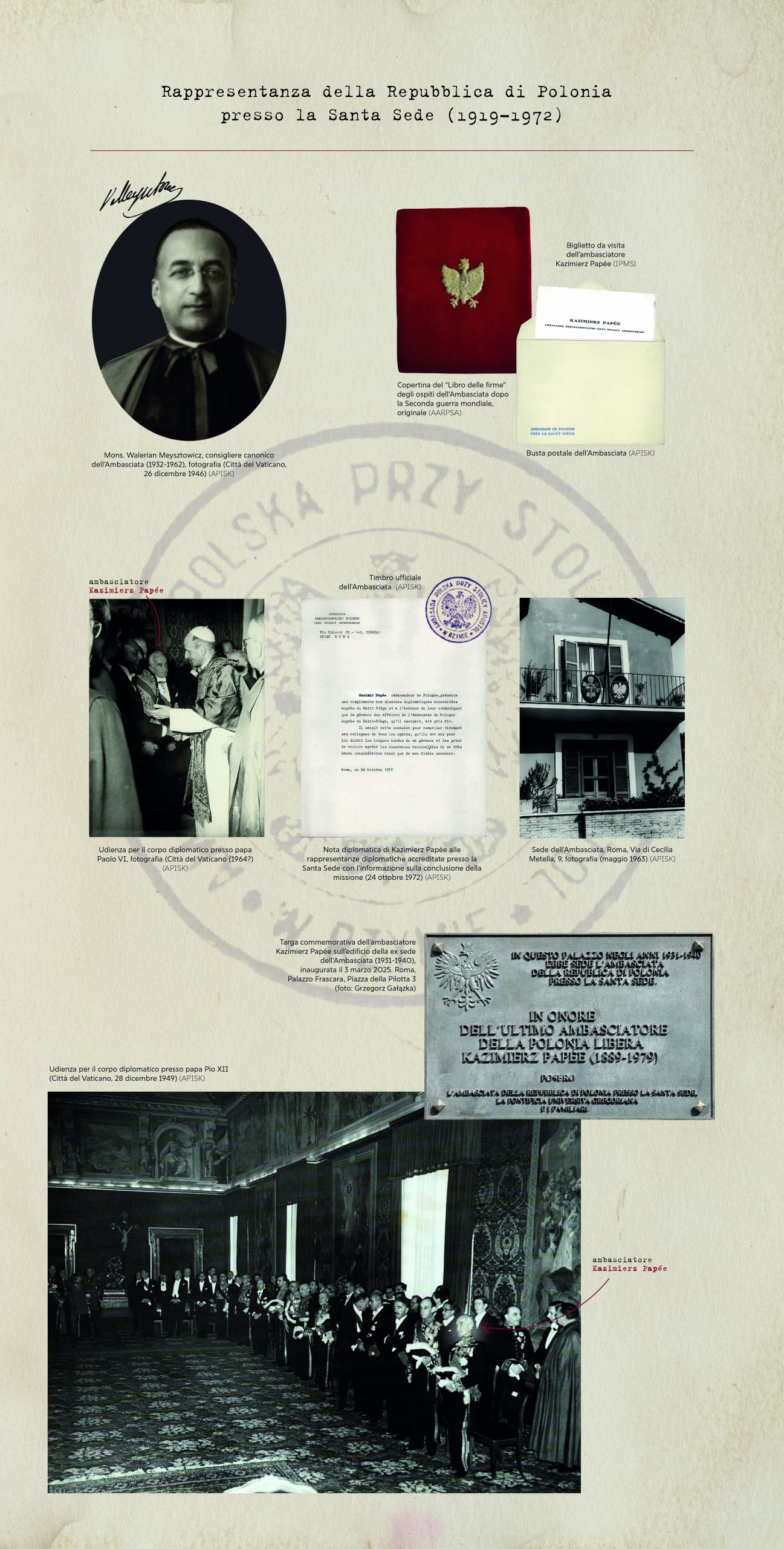 Zwraca też uwagę oryginalna mapa Watykanu z 1942 roku, w murach którego podczas wojny znalazła schronienie polska placówka dyplomatyczna, oraz nota dyplomatyczna Kazimierza Papée z 24 października 1972 roku, skierowana do zagranicznych przedstawicielstw akredytowanych przy Stolicy Apostolskiej, informująca o zakończeniu misji.