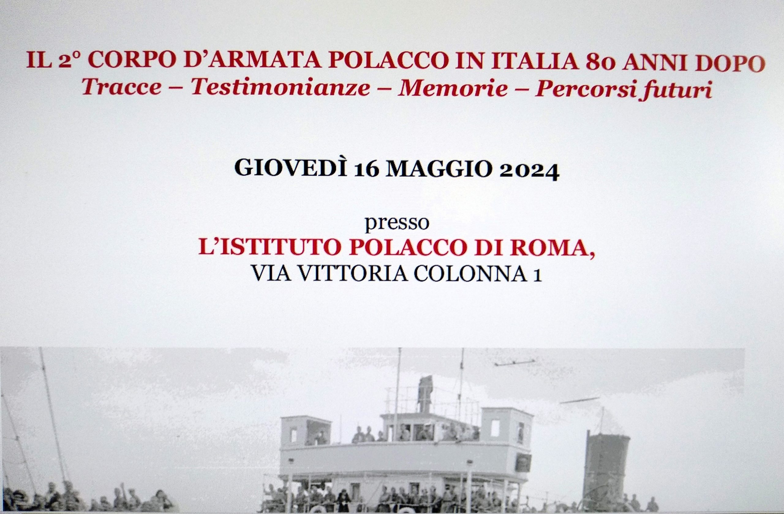 W Rzymie, dnia 16 maja br. w siedzibie Instytutu Polskiego przy via Vittoria Colonna odbyło się sympozjum „Il 2° Corpo d’armata Polacca in Italia a 80 anni dopo. Tracce – Testimonianze – Memorie – Percorsi futuri” (2. Korpus Wojska Polskiego we Włoszech 80 lat później. Ślady – Świadectwa – Wspomnienia – Dalsze dzieje).