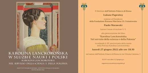 Dnia 27 czerwca 2022 w siedzibie Instytutu Polskiego w Rzymie odbyła się prezentacja, wydanej w tym roku książki, poświęconej zmarłej 20 lat temu w Rzymie Karolinie Lanckorońskiej (11.08.1898 – 25.08 2002) wybitnej ambasadorce Polski i kultury polskiej w świecie.